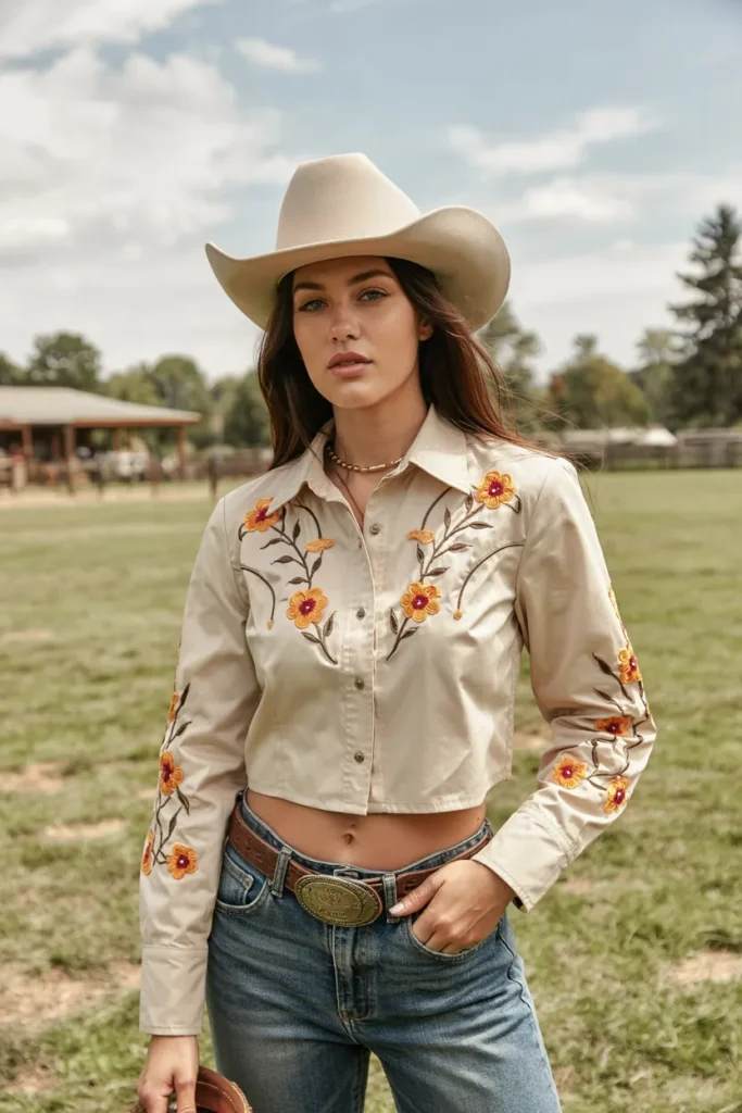 A western-inspired crop top paired with high-waist denim creates a youthful, flattering silhouette. Embroidered or structured details add authenticity while keeping the outfit modern.