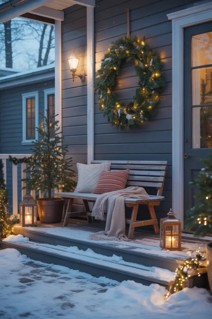 Lanterns placed near the bench cast a warm glow that mixes softly with the fairy lights overhead. Snow on the steps adds a gentle touch that makes the porch look peaceful. Sam likes this look for small-to-medium porches because it fills the space without needing too many decorations. It feels lived-in, warm, and inviting.