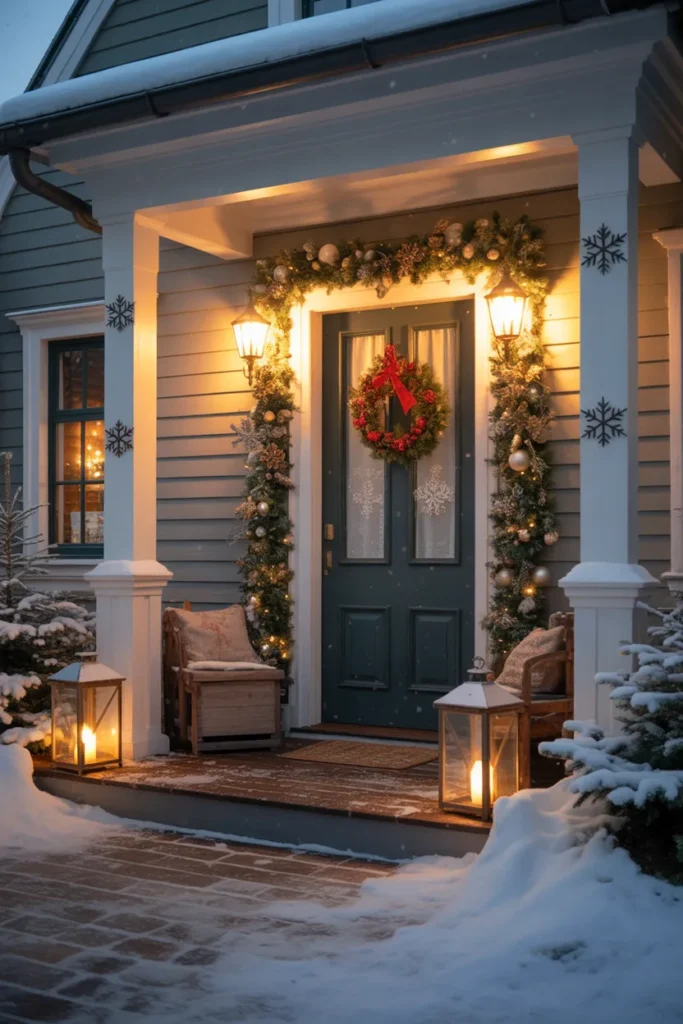 The snowflakes hanging from the columns add a playful winter touch, while the natural textures keep everything grounded. Candle lanterns bring gentle movement as the flames flicker in the early evening air. This style works well for small or large porches because the decorations stay close to the doorway. It gives a calm and peaceful look that blends nicely with a snowy winter setting.
