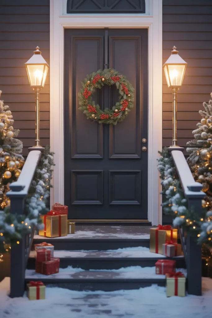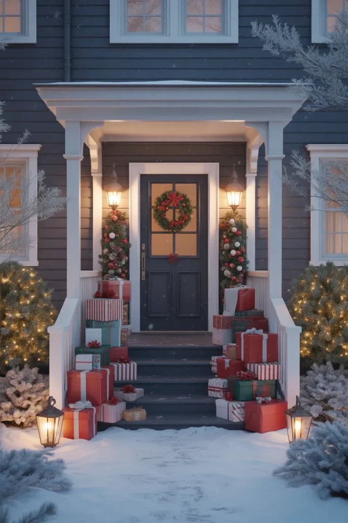 This porch uses decorative gift boxes to create a cheerful walkway leading up the steps. Sam selects boxes in calm patterns and soft colors so they don’t appear too loud. The frosted trees by the doorway help anchor the scene, giving balance to the playful pathway. Lanterns add steadiness with their warm glow.