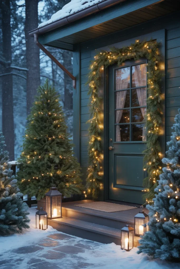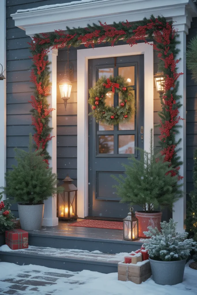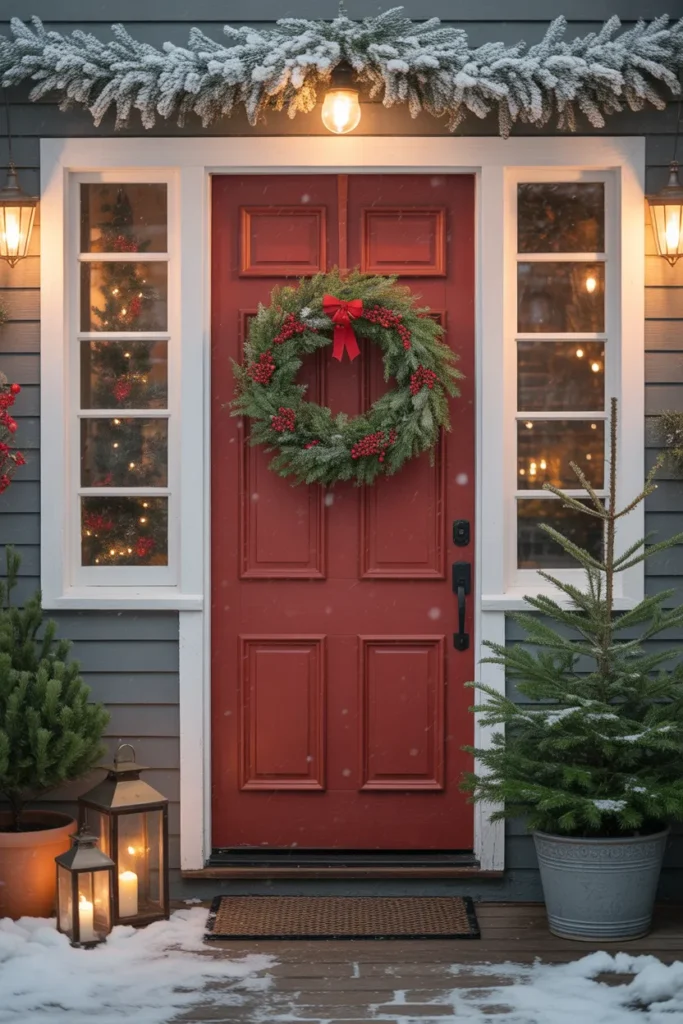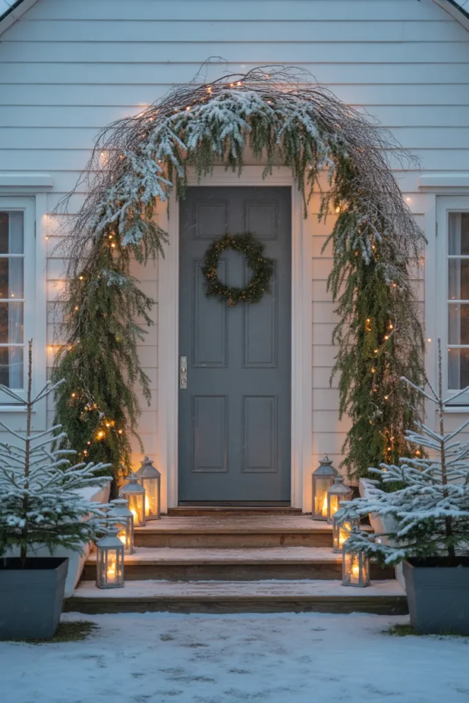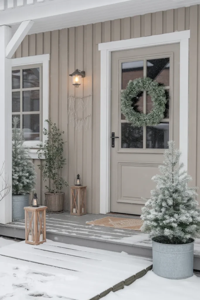 Lanterns placed on both sides help guide the eye toward the doorway and add steady warmth against the cool snowy tones. This style works well for homes that prefer natural and quiet décor. It blends well with winter weather and looks beautiful during gentle snowfall. The simple layout keeps the porch clean and uncluttered, letting the greenery stand out.