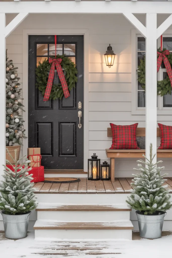 3. Farmhouse Christmas Porch with Plaid Accents