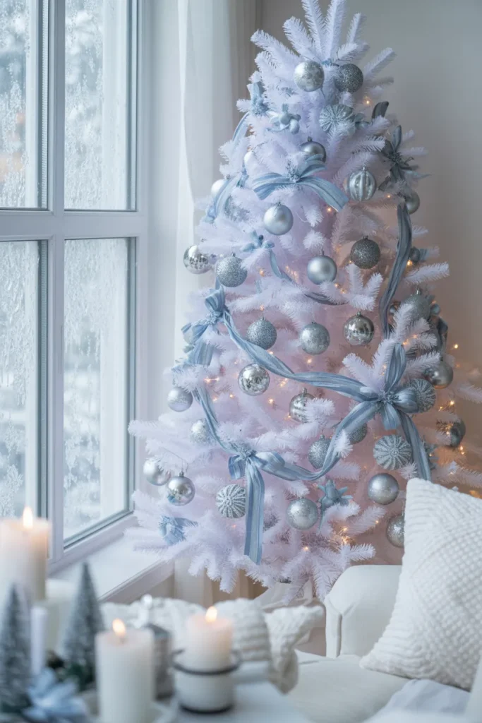 Add snowflake garlands or glass baubles for extra shimmer. Perfect for homes with light walls — the cool tones reflect light beautifully.