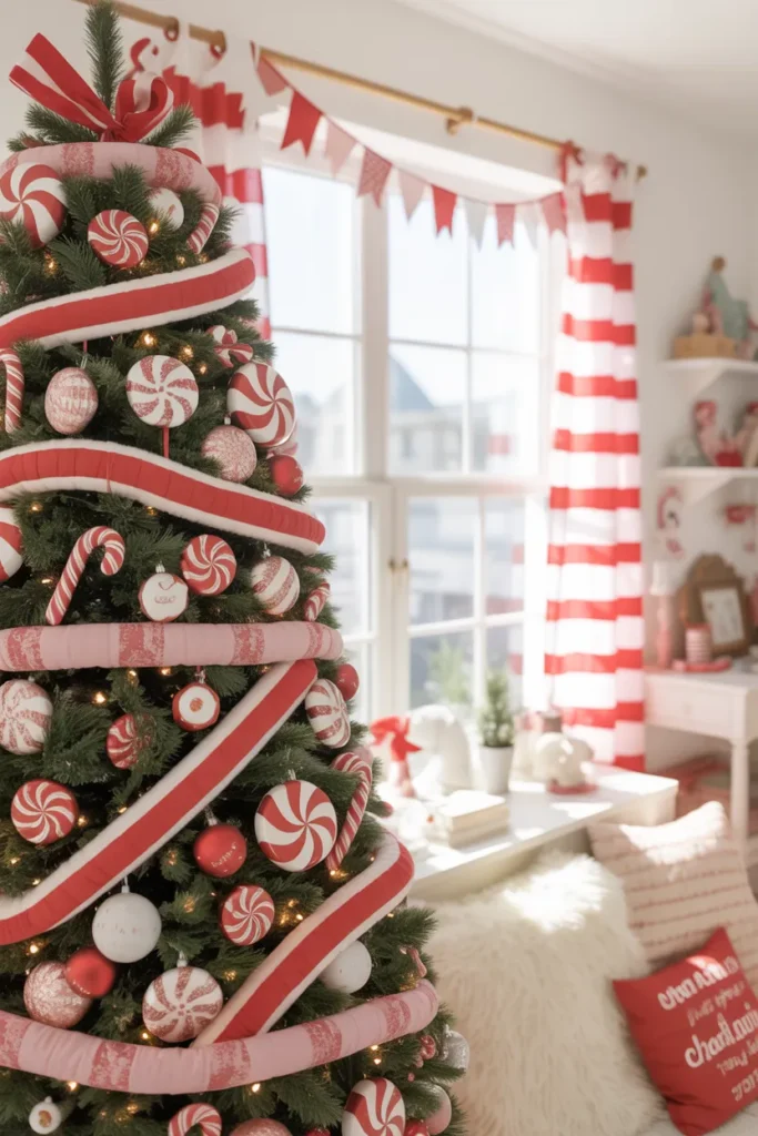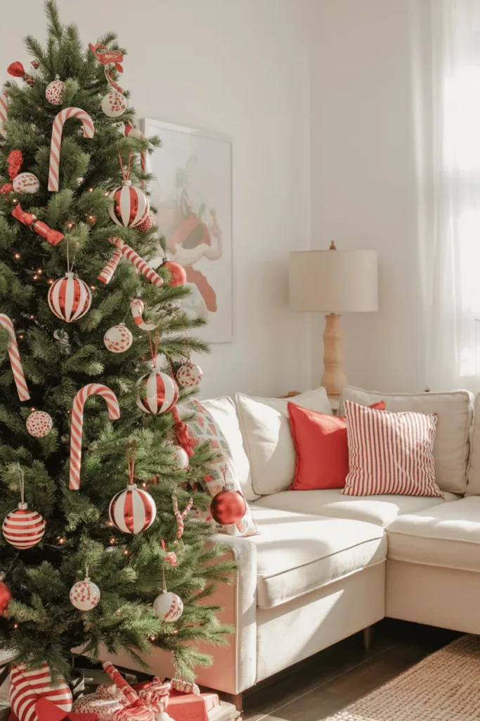 Add large candy ornaments and red ribbons for a bold finish. It’s cute, family-friendly, and the ultimate cheerful Christmas look.