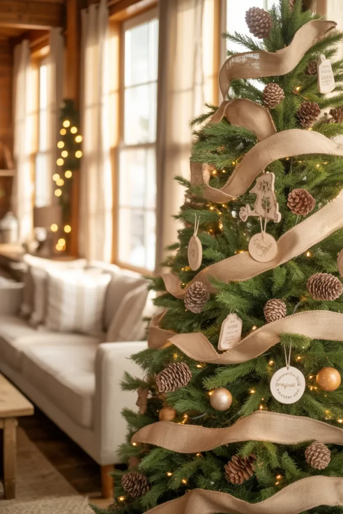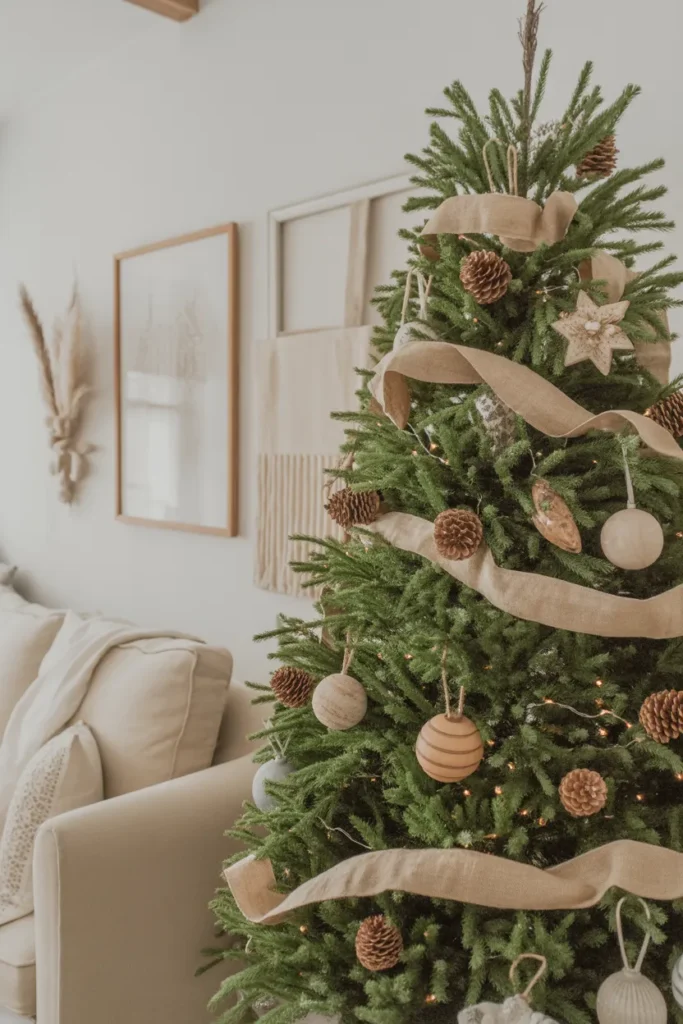 Add small straw stars or linen ribbons for a handmade feel. It’s the perfect tree for those who love understated elegance with a natural touch.