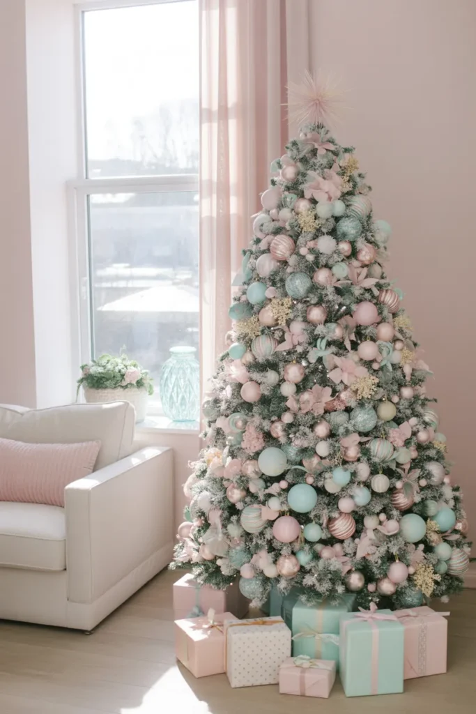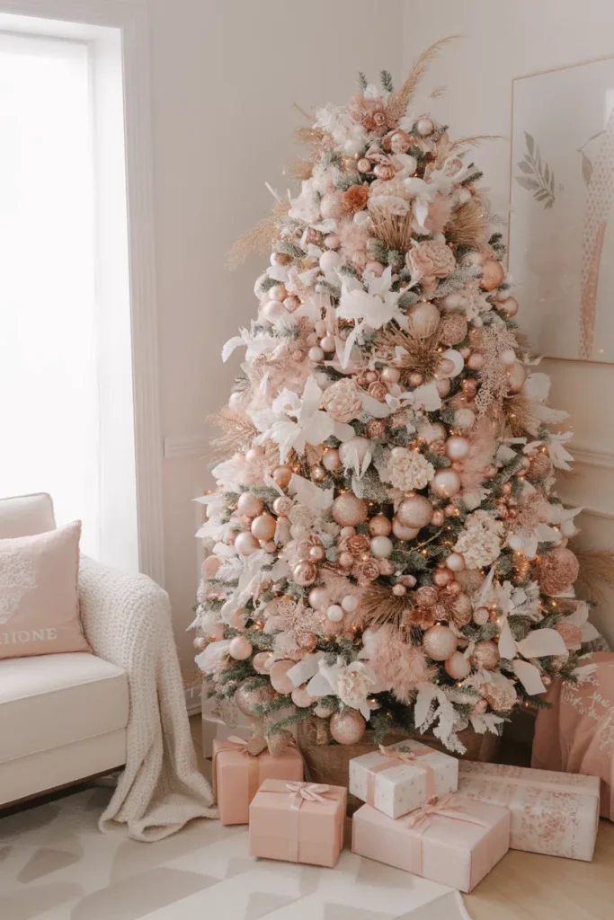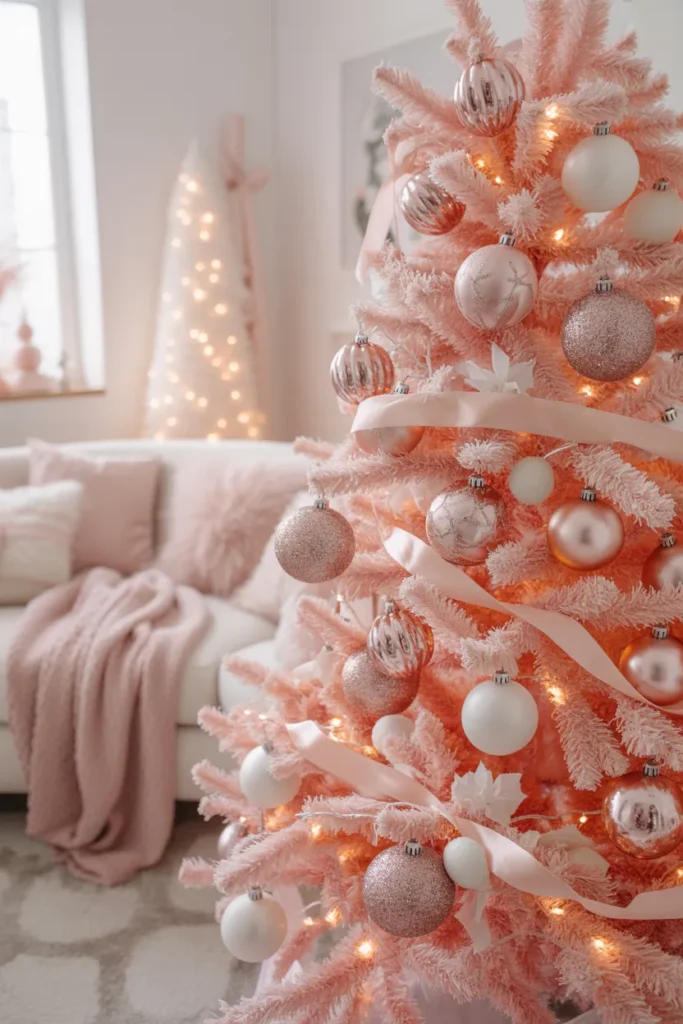 This dreamy pastel tree adds a romantic and whimsical touch to your Christmas décor. The pink and white tones sparkle softly in daylight, giving that Pinterest-perfect fairytale feeling.