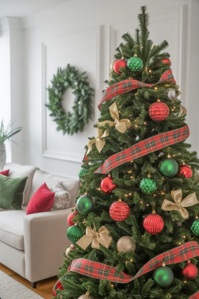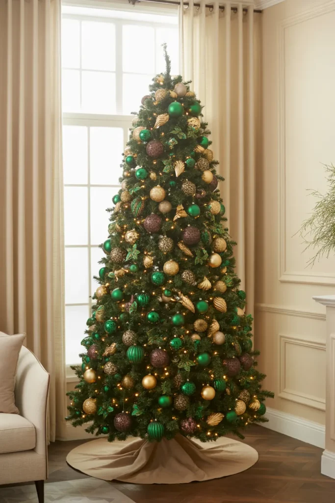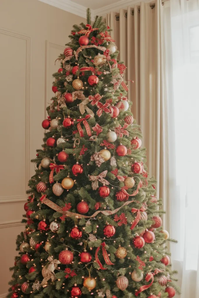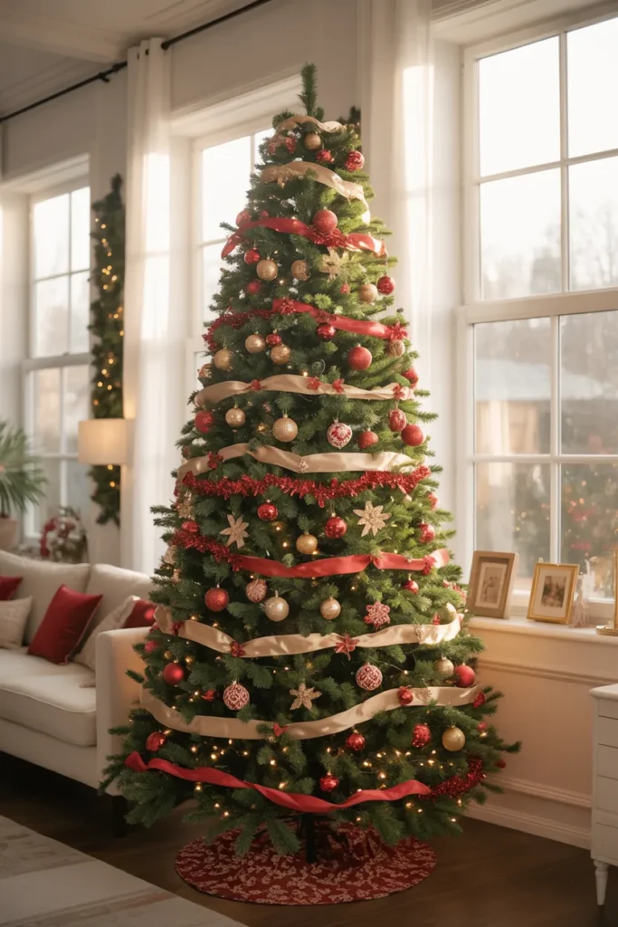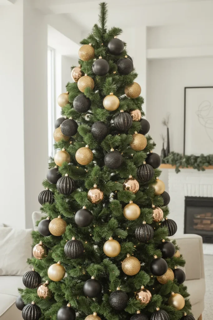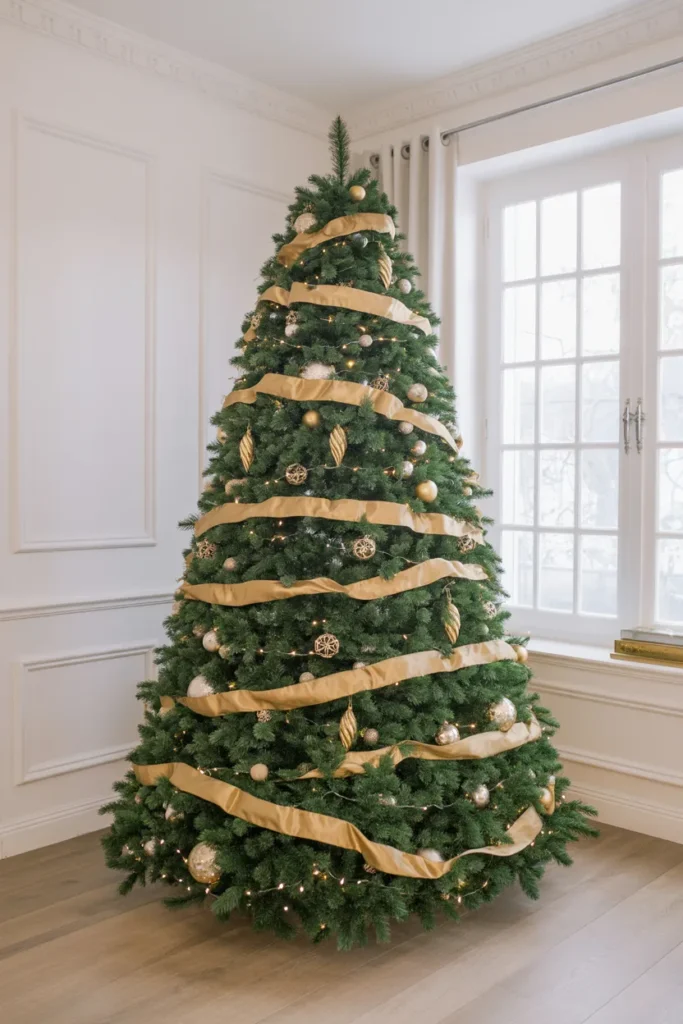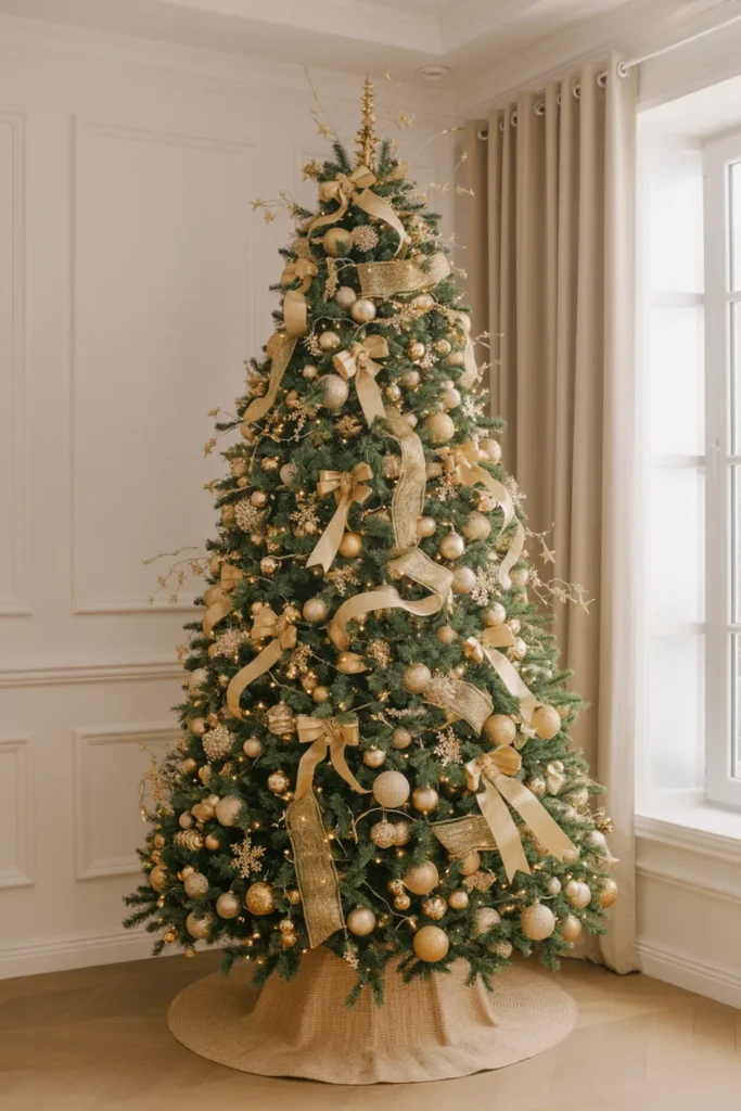 Add velvet ribbons or metallic baubles for richness. This tree feels grand yet balanced — perfect for homes that want bold luxury.