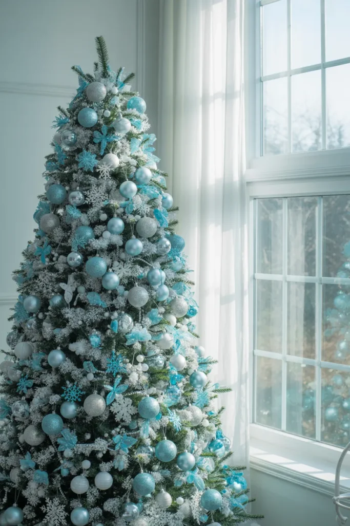 Add silver tinsel and icy garlands for more sparkle. Under daylight, this tree looks mesmerizing — clean, bright, and Pinterest-perfect.