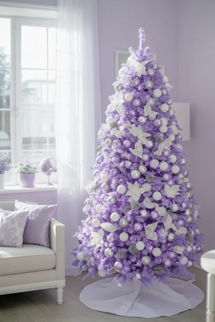 Add lilac ribbons and snowflake garlands to complete the look. It’s whimsical, romantic, and unique — a perfect color story for a cozy, feminine space.