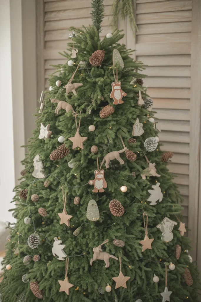 Add small fox, deer, or owl ornaments for charm. This style feels warm, comforting, and perfectly Pinterest-worthy for anyone who loves nature-inspired décor.