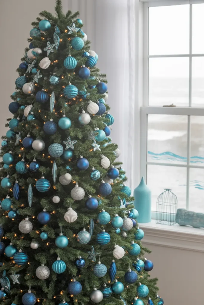 Add silver ribbons and sea-inspired ornaments for extra sparkle. It’s a beautiful way to mix seaside serenity with holiday magic.