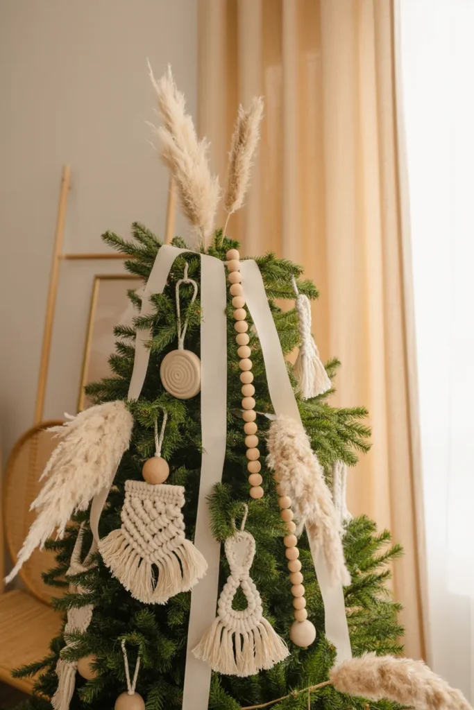 A boho-style tree is effortlessly cozy and creative. Neutral colors and handmade décor give it a calm, natural charm.