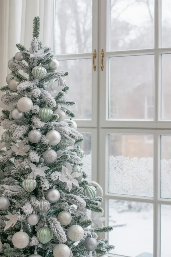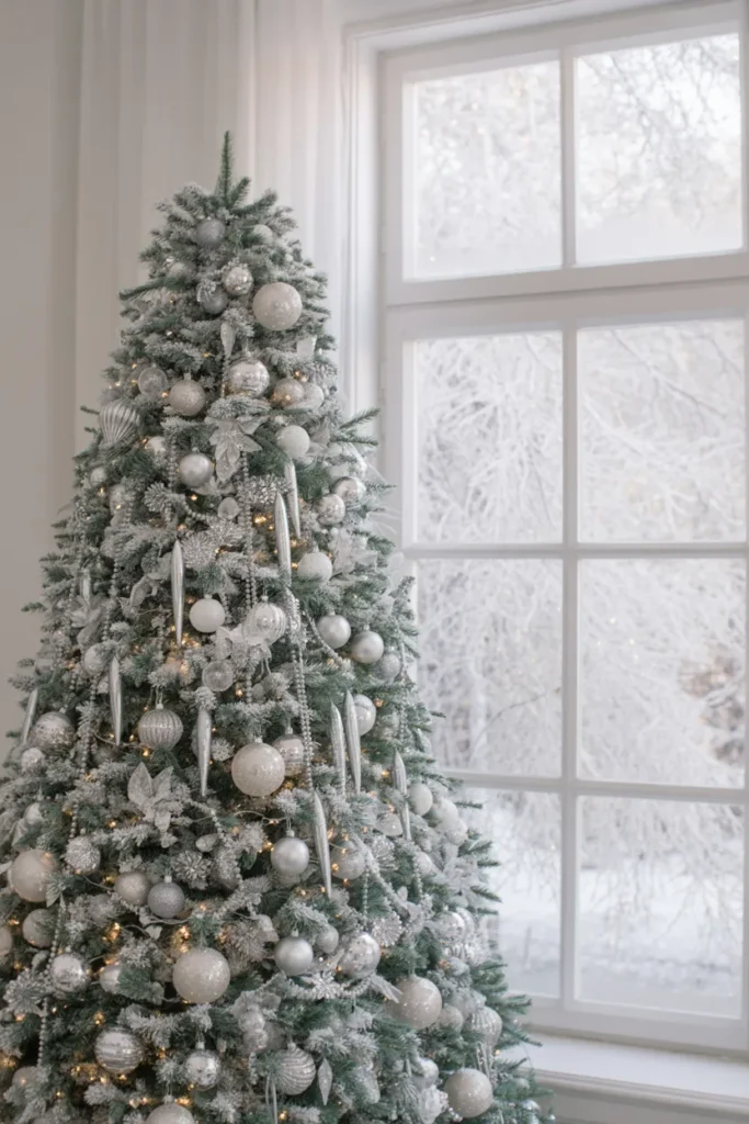 Add a silver tree topper and frosted garlands for extra sparkle. It’s clean, calming, and elegant — ideal for minimalist or nature-inspired spaces.