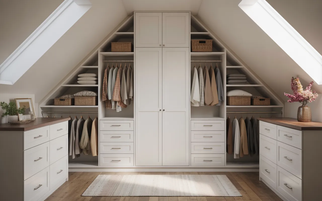 Using sloped wall shelving in an attic closet is a game-changer for small space solutions. These angled shelves take advantage of low-ceiling areas that are usually wasted, allowing for practical storage without cluttering the floor. In my experience, placing woven baskets or labeled bins on these shelves adds both functionality and a tidy, visually appealing look. This approach is especially effective in attics where every inch matters, creating a practical and inviting closet space while keeping the room open and easy to navigate for daily use.