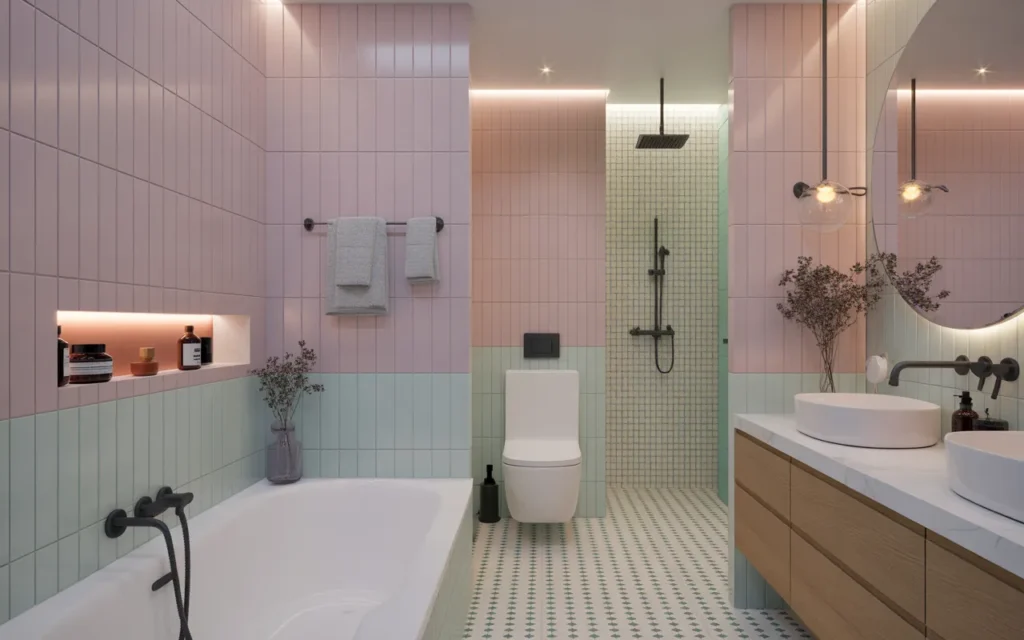 Soft pastel tiles introduce gentle color and charm to a modern bathroom. Shades like mint, blush, or soft blue add personality while keeping the space calm and balanced.