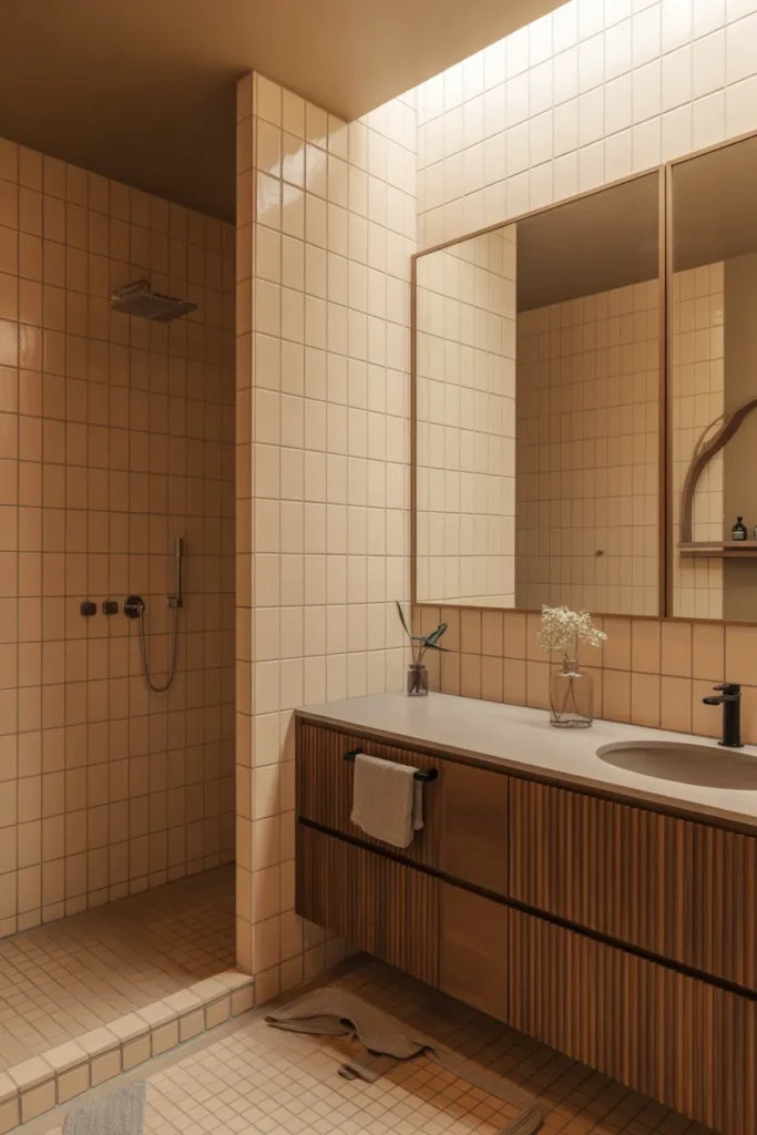 Paired with neutral fixtures, pastel tiles feel fresh and elegant. This design brings warmth and lightness, creating a welcoming bathroom that remains modern and visually soothing.