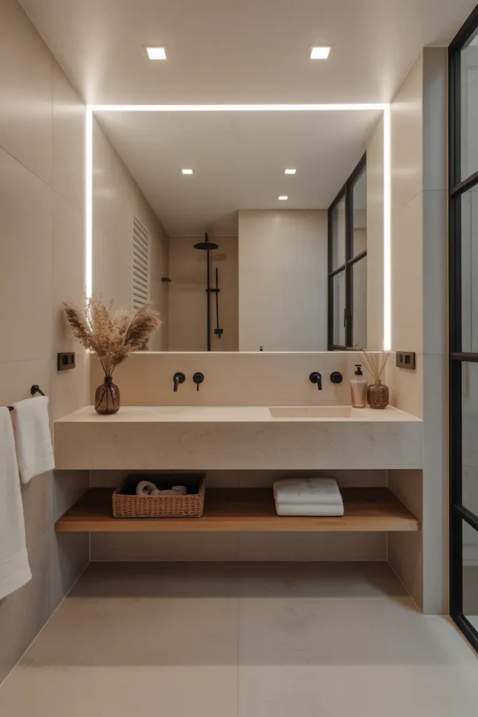 Energy-efficient and versatile, LED lighting allows customization for different needs. Thoughtful placement adds depth and warmth, making the bathroom both functional and visually appealing.