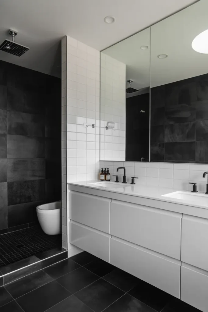 Balanced lighting ensures the bathroom remains open and inviting. This design feels bold yet refined, offering a classic color combination that remains stylish and adaptable over time.