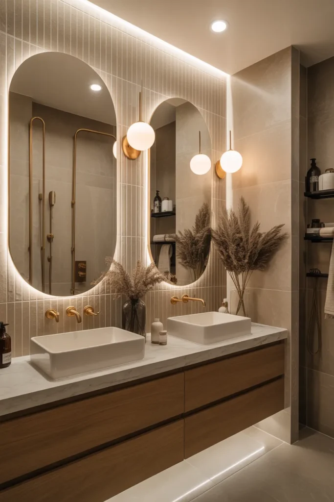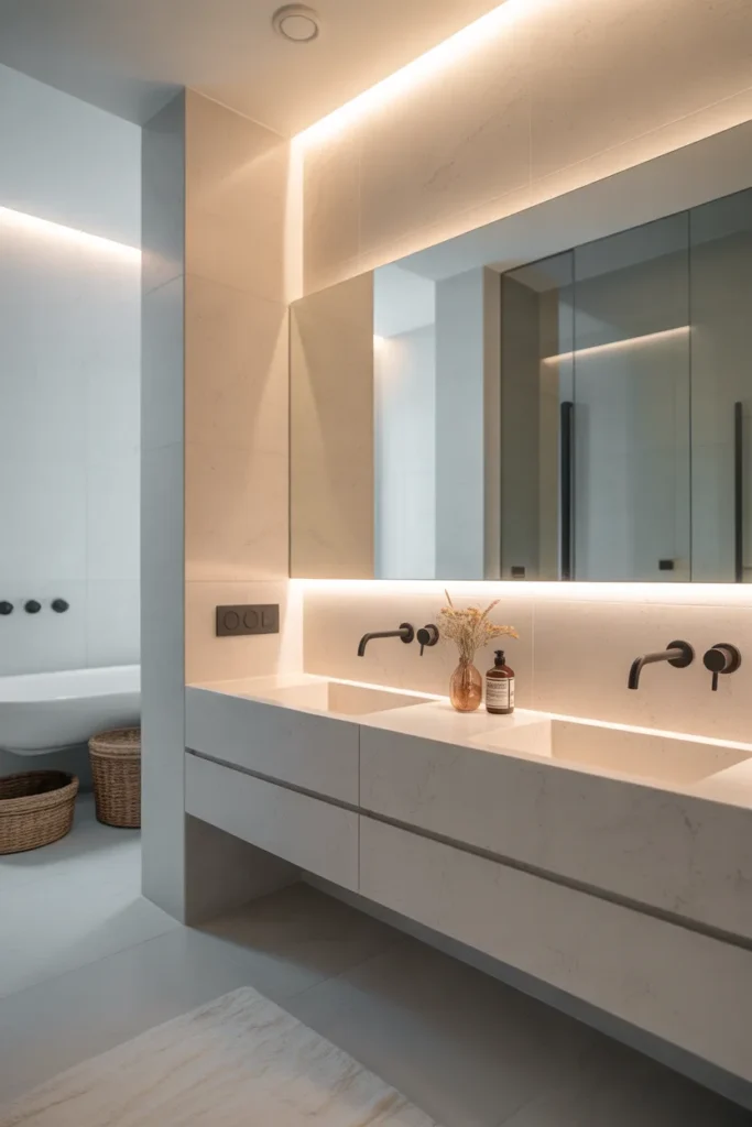 Soft ambient lighting transforms the bathroom into a calm and inviting space. Indirect light sources, such as hidden LEDs around mirrors or beneath vanities, create a gentle glow that feels soothing rather than harsh. This lighting highlights textures and materials beautifully.