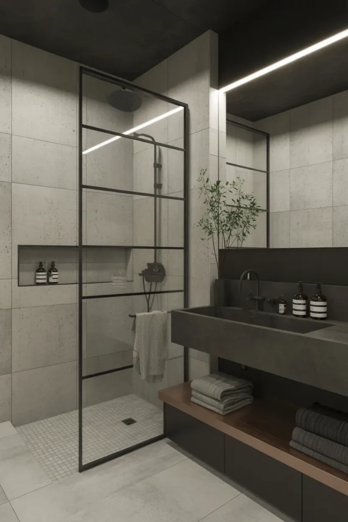 Soft lighting balances the rough materials, preventing the space from feeling harsh. This style feels confident and contemporary, offering a distinctive and stylish bathroom experience.