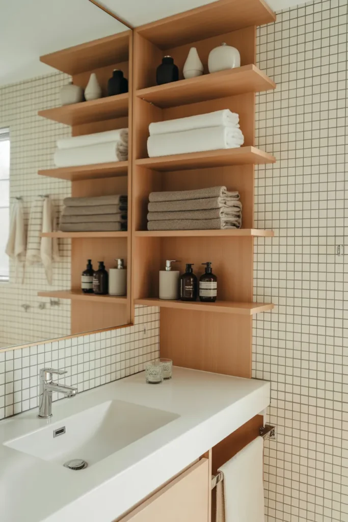 This approach encourages simplicity and order. When styled carefully, open shelves enhance visual balance and accessibility. Combined with neutral colors and clean lines, open shelving creates a bathroom that feels practical, welcoming, and effortlessly stylish.