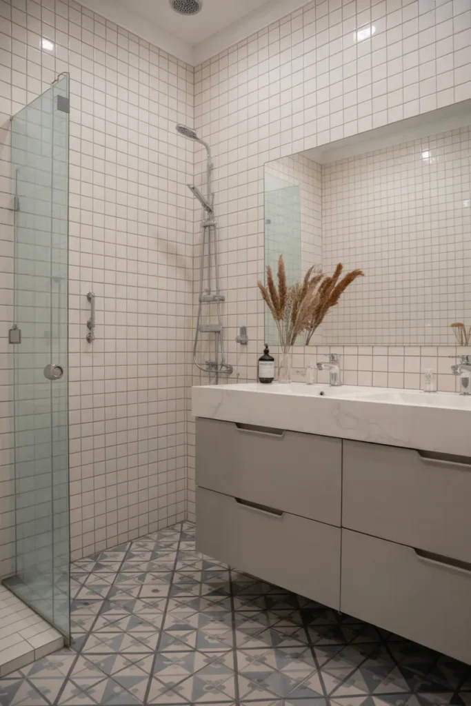 This design allows creativity while maintaining harmony. Soft color palettes keep the look refined, while geometric or subtle designs add movement and charm. Patterned tiles bring character and individuality to a clean, modern bathroom layout.