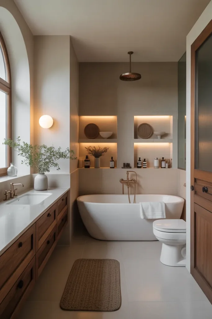 This design prioritizes comfort and tranquility. Gentle textures and warm light transform everyday routines into soothing experiences, making the bathroom feel like a personal retreat within the home.