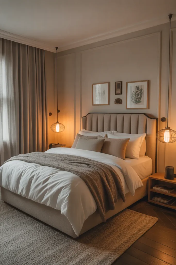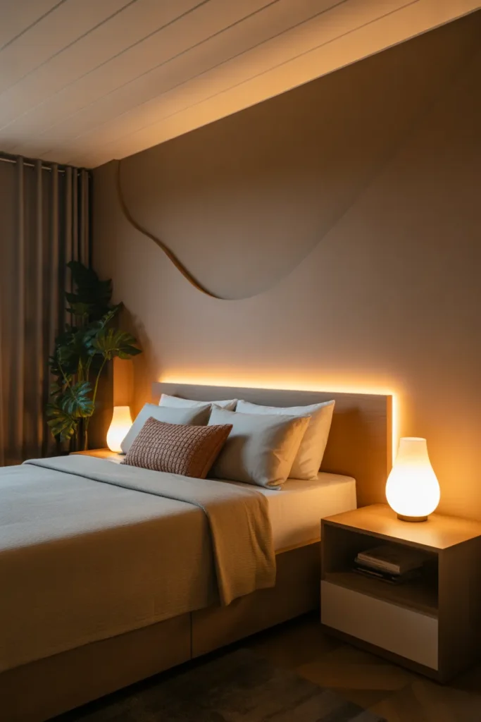 Well-placed accent lighting enhances depth and warmth. It helps define areas such as the headboard or artwork while keeping the room visually balanced. This design choice transforms a simple bedroom into an elegant retreat that feels peaceful and thoughtfully designed.