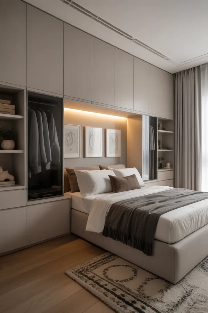 Built-in storage creates a clean and organized bedroom. Hidden cabinets and integrated shelves reduce clutter, allowing the space to feel open and calm. This design improves functionality while maintaining a refined appearance.