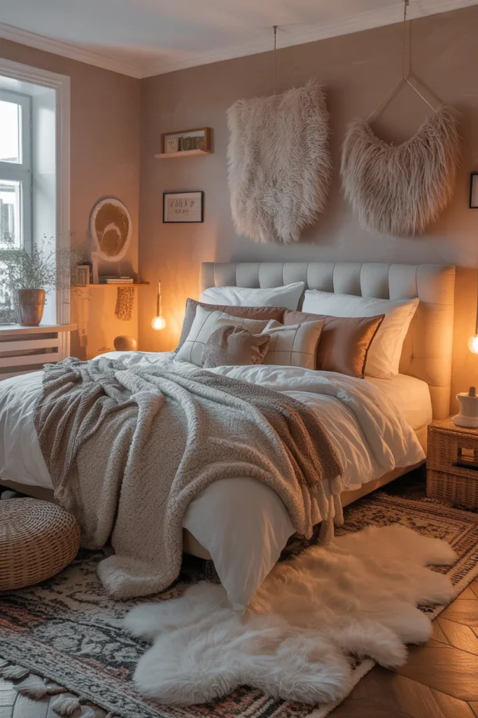 This design avoids excess decoration while prioritizing coziness. Layered bedding and subtle textures add warmth. The result is a bedroom that feels peaceful, modern, and effortlessly inviting.