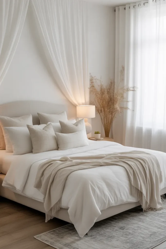 This layering enhances comfort and visual richness. Neutral fabrics blend seamlessly with bedding and furniture. Curtains help regulate light and create a cozy, refined atmosphere that feels both luxurious and restful.