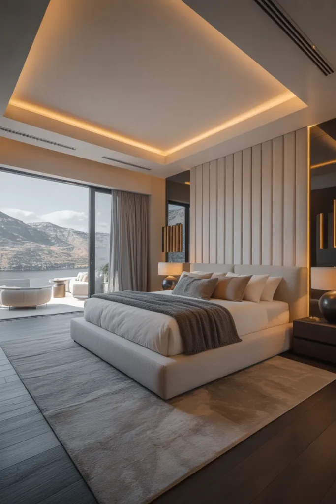 A modern luxury master bedroom focuses on space, quality, and comfort. Clean lines, neutral tones, and high-end materials create a polished yet relaxing environment. Plush bedding and carefully chosen furniture enhance comfort without cluttering the room. Warm lighting softens the modern elements, making the space feel welcoming.