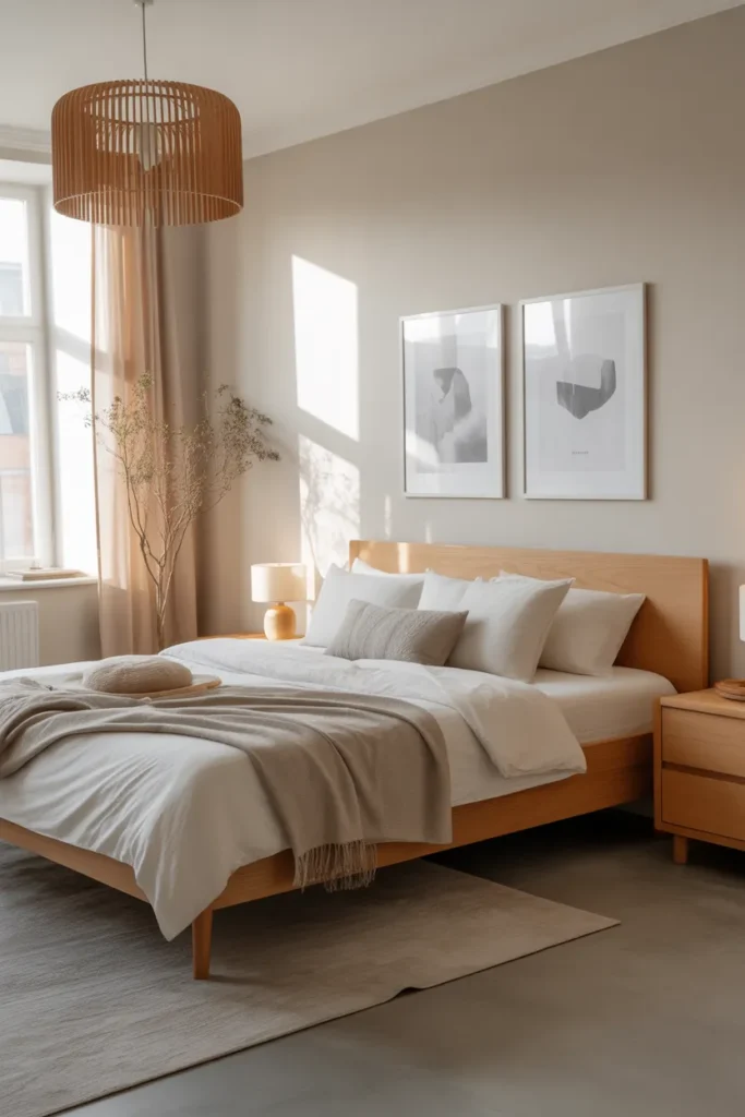 A Scandinavian comfort bedroom emphasizes simplicity, warmth, and functionality. Light wood furniture, neutral colors, and soft textiles create a calm and airy environment. Natural light plays a key role in enhancing openness and comfort.