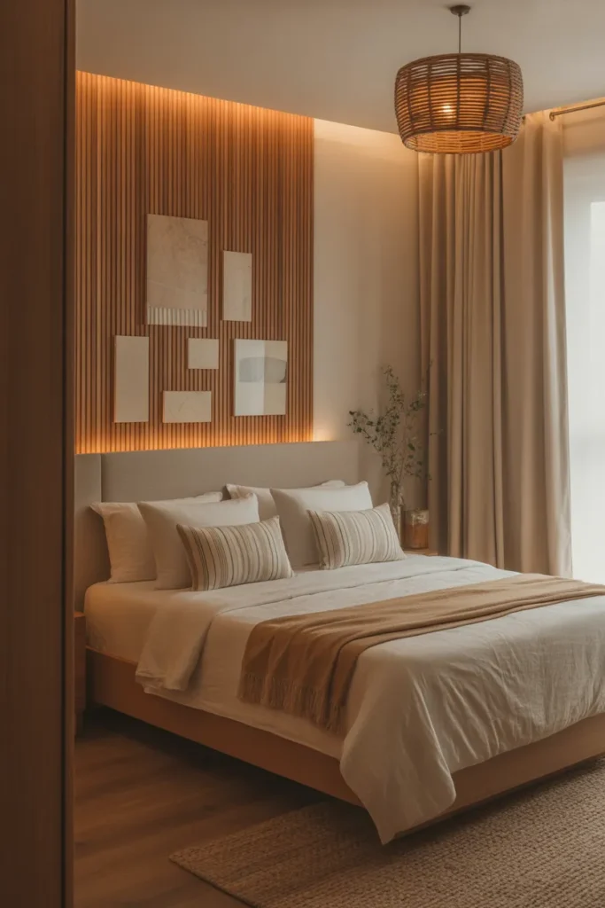 This design blends elegance with nature. The organic texture of wood balances modern elements, making the bedroom feel timeless and cozy. It is a perfect choice for those who want comfort with a natural, sophisticated touch.