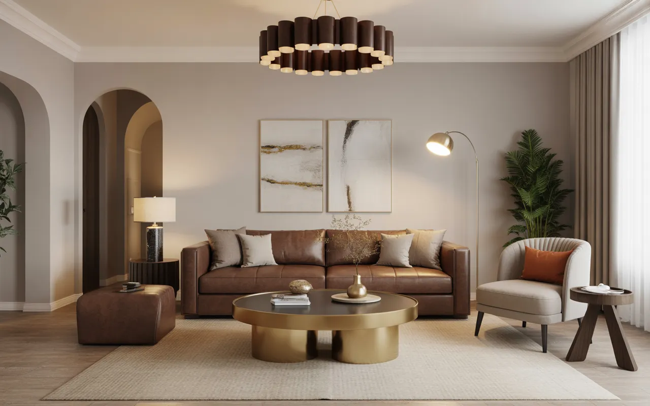 Transitional design bridges the gap between traditional and modern styles, creating a harmonious living room around a brown couch. Neutral armchairs, wooden furniture, and soft rugs balance modern clean lines with classic warmth. Accessories, like understated lamps, subtle artwork, or decorative objects, complement the color palette without overwhelming the space. The brown couch serves as a central piece that grounds the room while allowing flexibility in styling. This approach results in a living area that feels sophisticated, comfortable, and versatile—perfect for contemporary homes seeking a blend of timeless elegance and modern design.