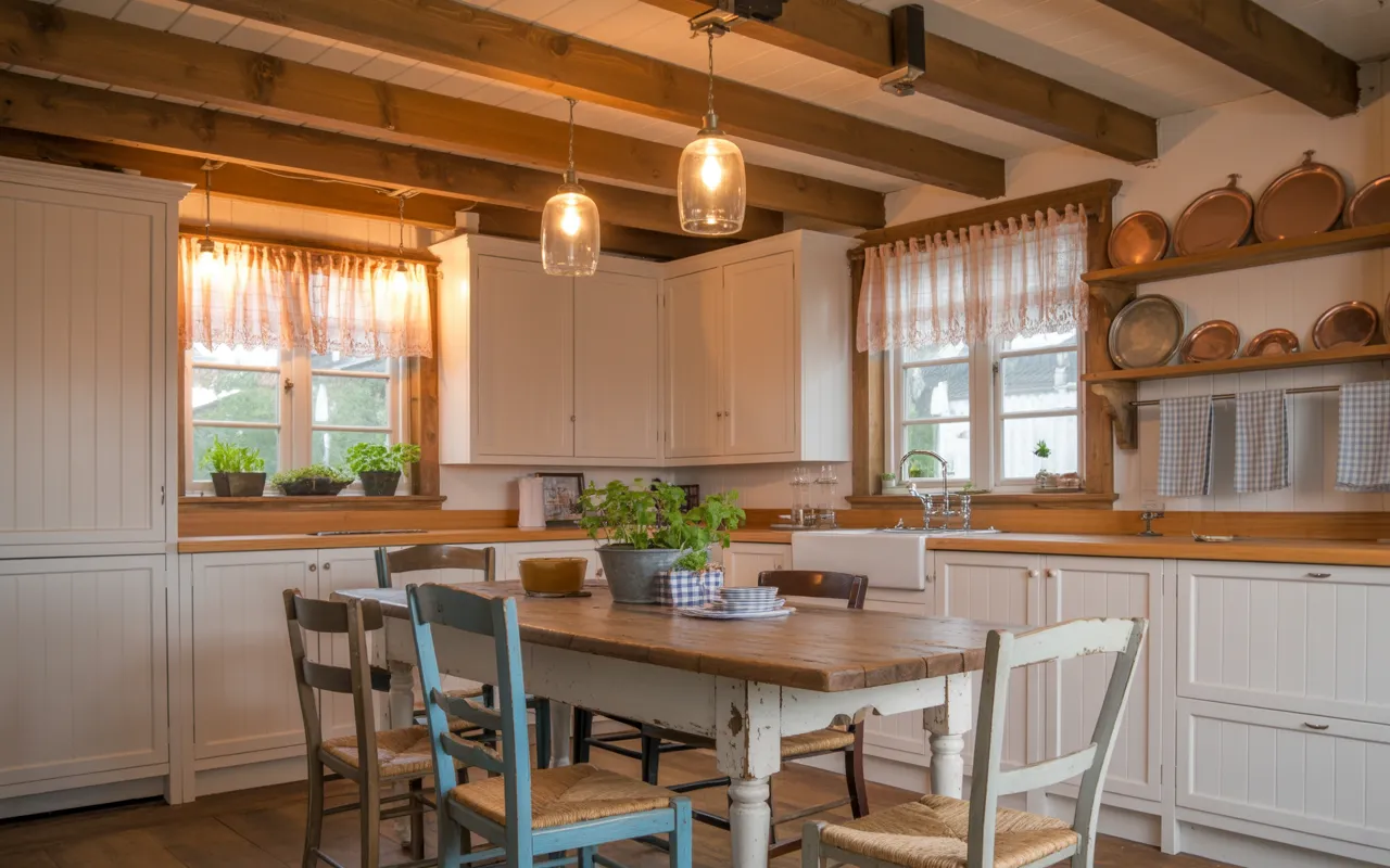 To enhance the look, consider adding a wooden dining table, woven baskets, and soft pendant lighting. These elements work together to highlight the natural textures in the room. Decorative accents such as vintage dishes or simple greenery can complete the cozy setting. With the addition of wooden beams, the kitchen gains a timeless charm that feels both welcoming and authentic.