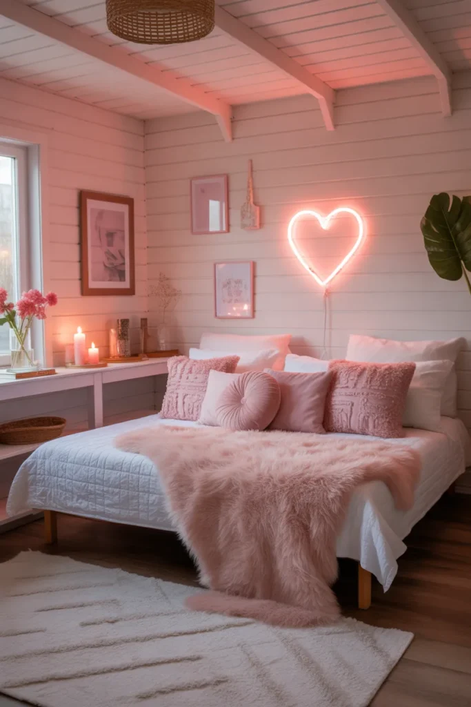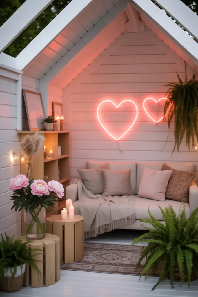 This dreamy retreat she shed is inspired by the soft, aesthetic style you described in your example. White walls paired with natural wood accents create an airy yet warm atmosphere. Warm-toned candles and a neon heart light bring a romantic glow that makes the space feel magical. Neutral pillows in beige, cream, and soft pink enhance the cozy seating area.