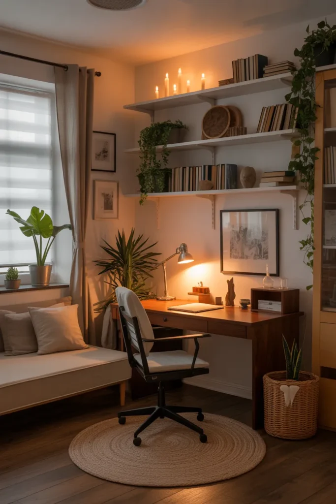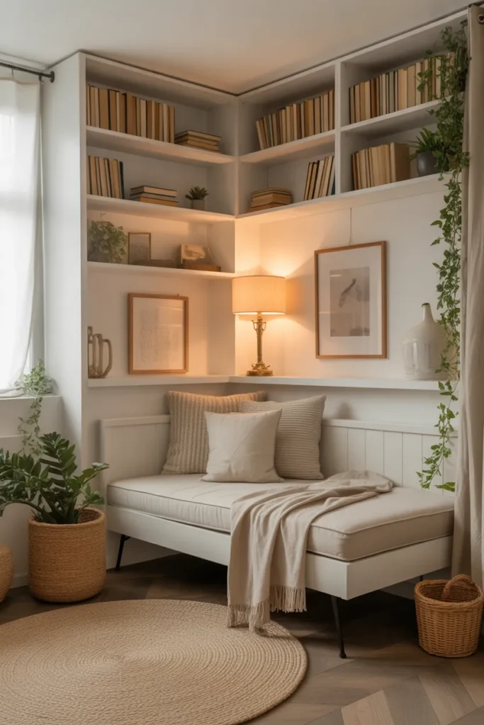 This cozy writer’s nook is designed for deep thinking, storytelling, and creativity. With a warm desk lamp casting a gentle glow across the wooden writing table, the room feels focused yet soothing. The white walls keep the small space bright, while the beige daybed offers a comfortable place to stretch out or brainstorm ideas. Shelves filled with favorite books complete the peaceful atmosphere.