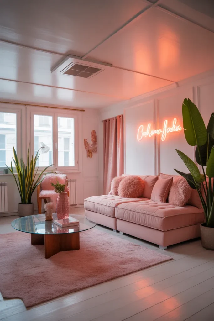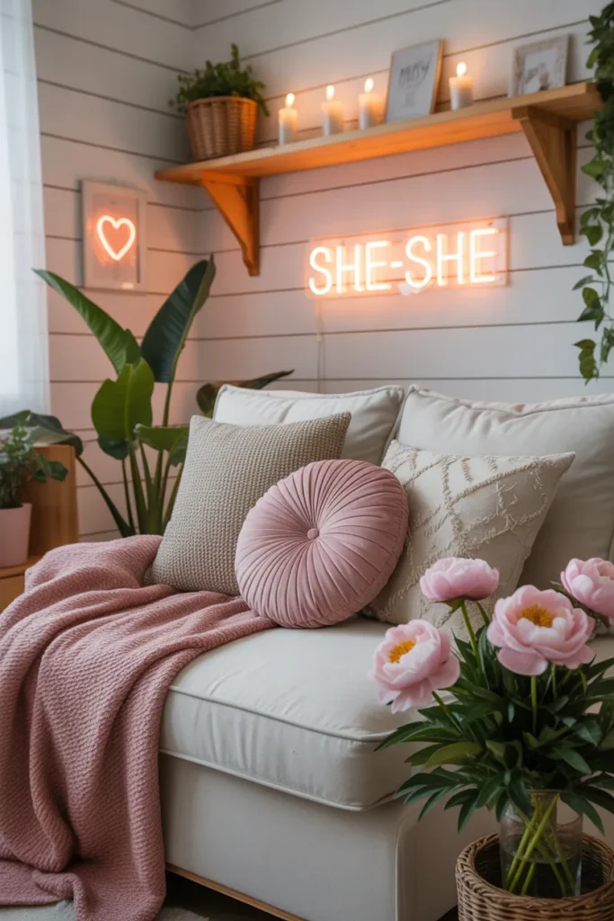 A modern glam she shed blends chic elegance with cozy comfort. Rose-gold accents paired with glossy white walls create a luxurious, Pinterest-perfect vibe. The plush pink cushions elevate the room’s femininity while maintaining a soft, warm ambiance. Neon lights—especially warm-tone ones—add personality and highlight the modern aesthetic beautifully.