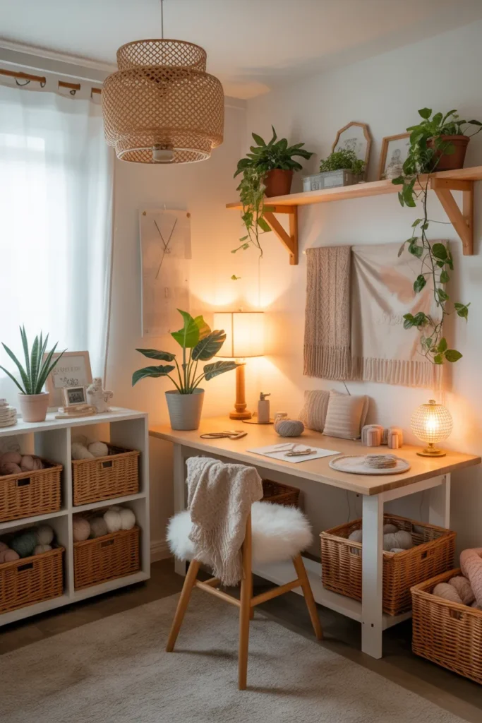 Plants placed near the window add natural beauty and help keep the room fresh. The white walls ensure the workspace stays bright and uplifting, boosting creativity. This she shed is ideal for anyone who loves creating handmade pieces in a peaceful environment. It’s a dream space where creativity can flow freely without distractions.