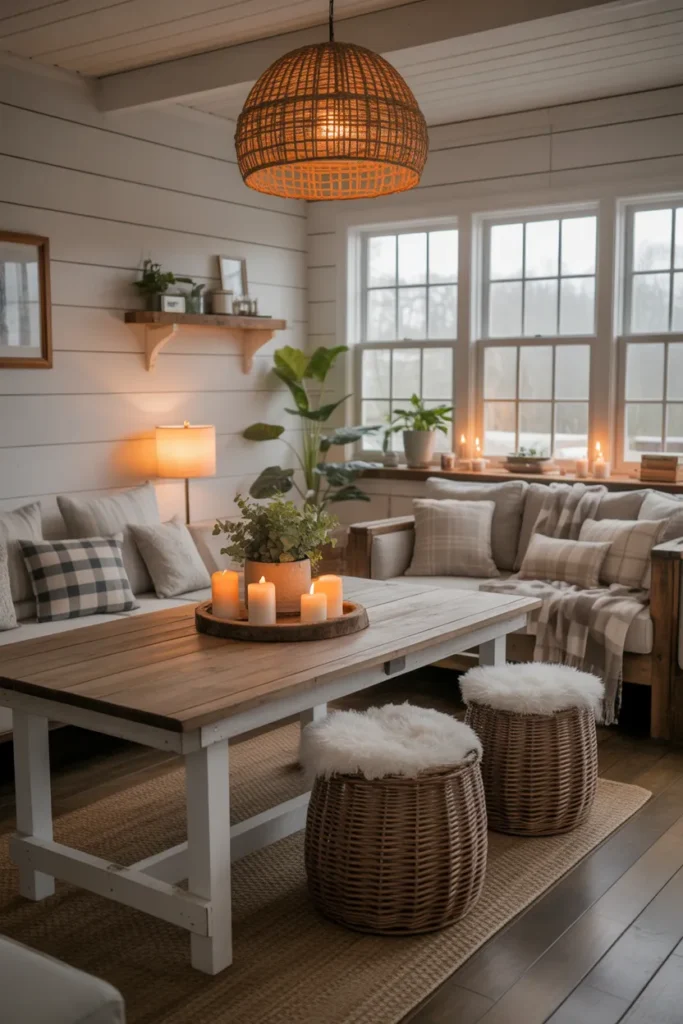 A farmhouse-style she shed offers the perfect mix of rustic warmth and cozy charm. White shiplap walls brighten the interior while plaid blankets add a classic countryside feel. The rustic wooden table adds character and serves as a functional space for crafts or tea time. Warm candles bring a gentle glow that makes the whole room feel instantly welcoming.