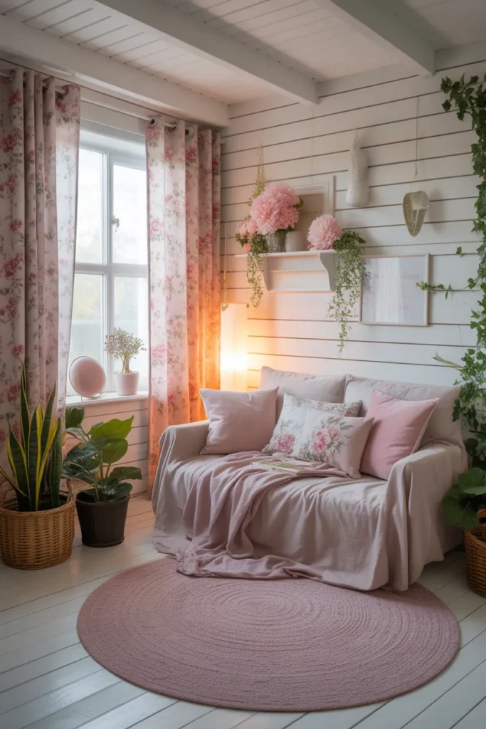Elegant plants and pink peonies add fresh, feminine beauty while maintaining the relaxing vibe. A patterned rug grounds the room and completes the soft, serene theme. This she shed is perfect for anyone who wants a peaceful escape filled with warm lighting, gentle décor, and a dreamy Pinterest-ready atmosphere. It’s cozy, creative, and beautifully soothing.