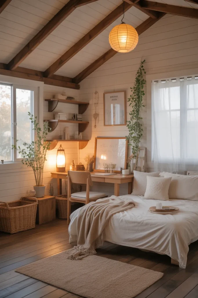 Plants placed near the windows invite nature inside, refreshing the air and adding soft pops of green. Every detail—from the candles to the wooden textures—works together to create a peaceful retreat. This she shed is ideal for Pinterest users who adore whimsical, dreamy aesthetics and want a space that feels like a comforting escape. It’s truly a little fairytale room brought to life.