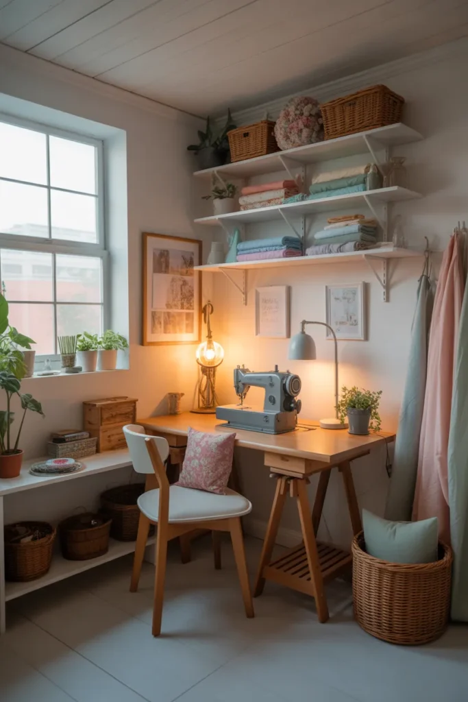 This sewing studio she shed is perfect for anyone who loves stitching, quilting, or designing clothing. The wooden sewing table offers a roomy, functional workspace. Soft warm lighting helps reduce eye strain and creates a welcoming atmosphere. White walls keep the small area bright and make the colorful fabrics stand out beautifully.