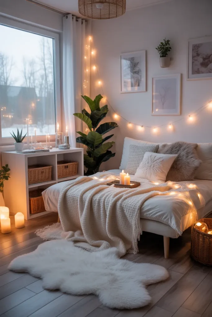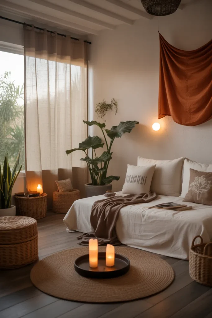 Strategically placed candles build a gentle, romantic ambiance without overcrowding the small interior. Wooden shelves hold meaningful trinkets, books, or tiny potted plants that complete the natural boho look. This style is ideal for Pinterest audiences who adore comfort, crafts, and a relaxing atmosphere. Every detail evokes peace, balance, and a soft cottage charm that feels like a warm hug.
