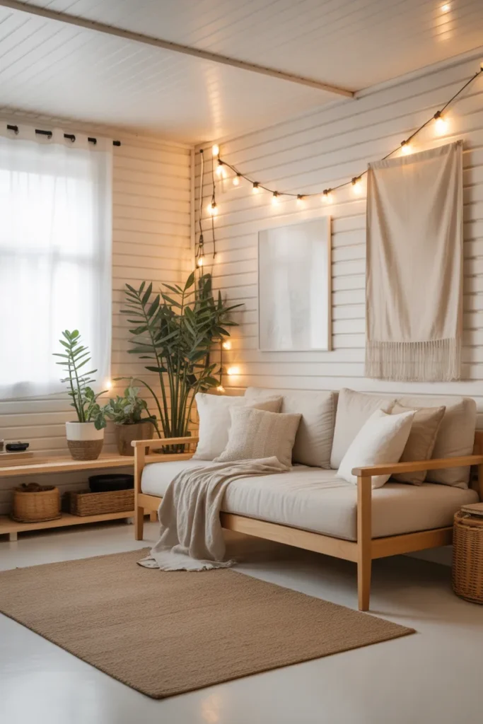 Plants add a touch of greenery that complements the natural tones beautifully. Soft textures like woven rugs and plush pillows make the shed feel like a calm retreat. This look is perfect for Pinterest audiences who love clean, aesthetic interiors. It’s stylish, cozy, and easy to personalize—making it a dreamy backyard escape.