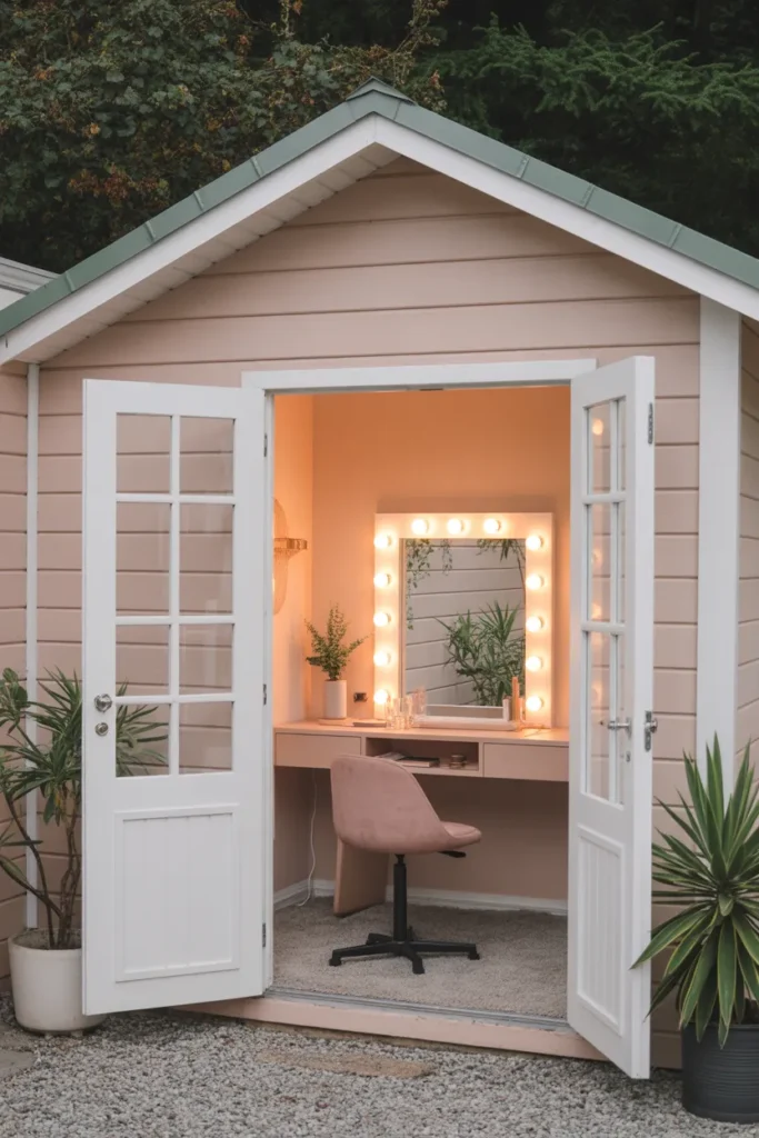 A few plants add freshness and bring balance to the glam aesthetic. The cozy seating area lets you enjoy self-care moments in a peaceful, beautiful environment. This she shed is perfect for Pinterest users who love beauty, skincare routines, and stylish vanity setups. It’s a luxurious but cozy place to glam up, relax, and feel amazing.