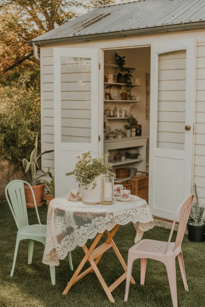 This vintage tea room she shed is a charming blend of elegance and nostalgia. Floral teacups and pastel chairs bring a sweet, feminine vibe to the small interior. A lace-covered table adds a delicate touch that makes the space perfect for tea-time moments or slow mornings. The white walls keep everything light and fresh while highlighting the vintage details.
