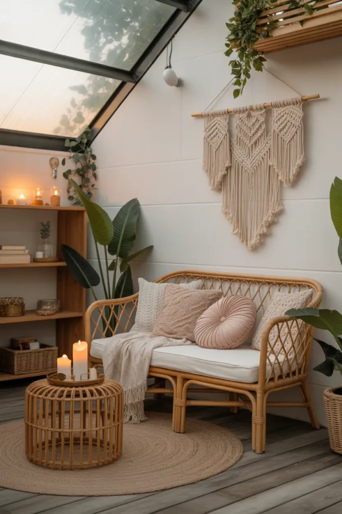 This romantic boho she shed is filled with textures, warmth, and soft beauty. Macramé décor adds a handmade charm, while pink candles create a cozy and romantic glow. The layered pillows and throws in beige and cream make the seating area incredibly inviting. White walls highlight the boho accents beautifully.