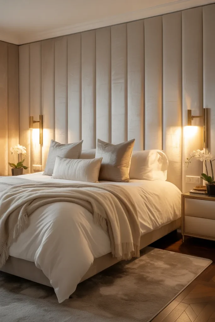 Textured wall panels behind the bed add depth and sophistication without relying on bold colors. Upholstered, wood, or slatted panels create a refined focal point that enhances the room’s warmth. Neutral tones keep the design calming while adding visual interest and structure.